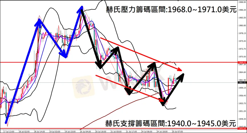 今日(7月25日)黃金早盤在1954.6美元/盎司附近,從技術分析面切入,1小時級別觀察黃金走勢,符合昨日(24日)預測K棒反彈後持續下跌修正,空單獲利入袋,目前K棒保持空方行情,有望反彈遇下降通道上軌壓力後持續下跌行情,因此建議外匯市場投資人,今日黃金操作心態持續以偏空看法為主。