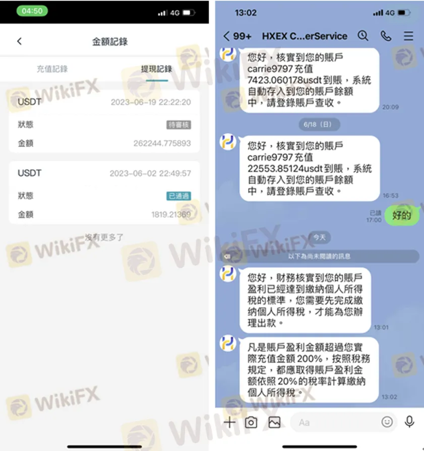 HXEX的客服表示,由於受害者的帳戶獲利金額超過儲值金額的200%,必須按照稅務規定繳納獲利的20%,因此需要繳204712.8USDT,也就是大約新台幣630萬元。受害者因為身上沒那麼多錢,希望直接從帳戶裡扣除稅金,卻被告知必須單獨繳納,而且如果不能在6/27之前付完這筆費用,帳戶就會永久凍結、無法出金。要交付20%的個人綜所所得稅,未能於期限內繳交稅金就永久凍結帳戶、無法出金。