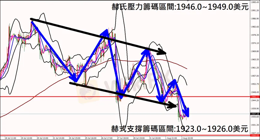 今日(8月3日)黃金早盤在1934.6美元/盎司附近,從技術分析面切入,1小時級別觀察黃金走勢,再次符合昨日(2日)預測K棒重挫下跌同時跌破低點,空單再次獲利入袋,目前K棒仍保持空方排列,有望跌深反彈後持續下跌,因此建議外匯市場投資人,今日黃金操作心態持續以偏空看法為主。
