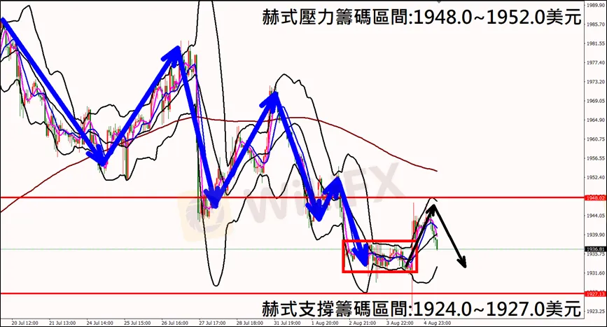今日(8月7日)黃金早盤在1942.2美元/盎司附近,從技術分析面切入,1小時級別觀察黃金走勢,上周五(4日)K棒短線破底後隨即強勢反彈,目前K棒拉回在布林通道中軌下方,同時開口再度朝下,若再次跌破低點則有望重挫下跌,因此建議外匯市場投資人,今日黃金操作心態持續以偏空看法為主。
