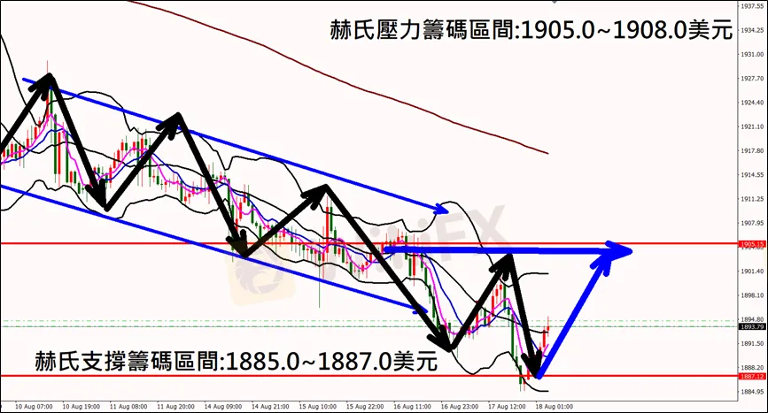 今日(8月18日)黃金早盤在1889.4美元/盎司附近,從技術分析面切入,1小時級別觀察黃金走勢,符合昨日(17日)節目分析K棒盤中出現反彈行情,多單獲利入袋後再次探抵,目前K棒落在低點反彈站上布林通道中軌上方,另外MACD指標再次出現黃金交叉,有望再次反轉向上,因此建議外匯市場投資人,今日黃金操作心態持續以偏多看法為主。