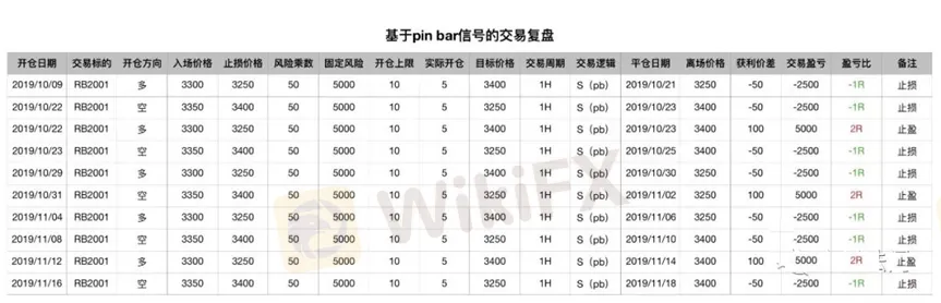 比如,你開始專注於做1H週期的pb信號,自己做了這樣一個交易日誌,交易一算時間之後,你發現一個問題,那就是勝率比較低,例如圖中我隨便類比了10筆交易,單純利pb交易的勝率是 30%。
