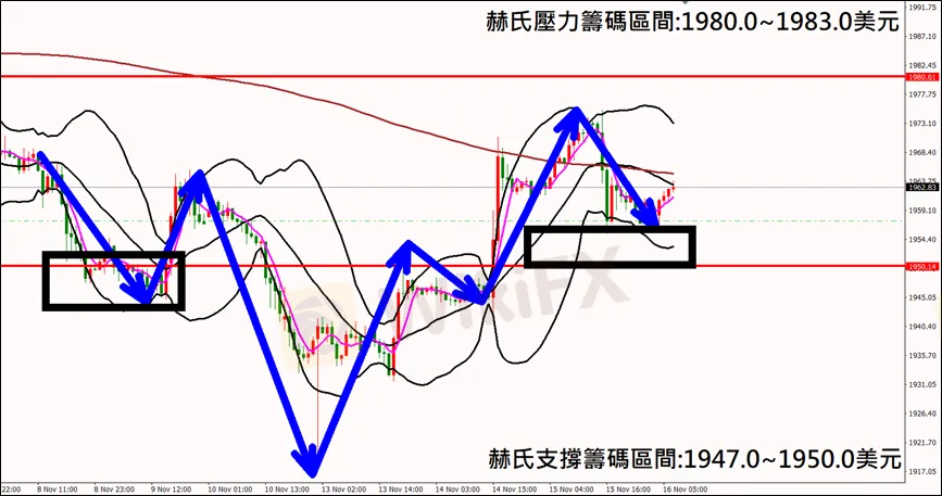 今日(11月16日)黃金早盤在1959.3美元/盎司附近,從技術分析面切入,1小時級別觀察黃金走勢昨日(15日)K棒盤中遇壓力後拉回修正,目前K棒下跌至中軌附近震盪,有望重新站上後再次反彈上漲,因此建議外匯市場投資人,今日黃金操作心態嘗試以偏多看法為主。
