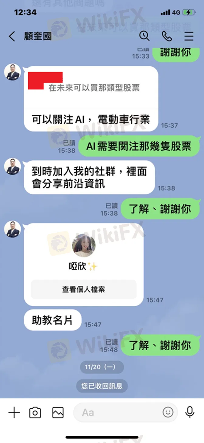 一開始,受害者是在網路上被一個投資廣告吸引,因此與一位叫「顧奎國」的老師聯繫上,並且得到了一些行情資訊,之後又在對方的介紹下加了助理「啞欣」的LINE,還進入「ㄥ縱橫江湖」這個群組。