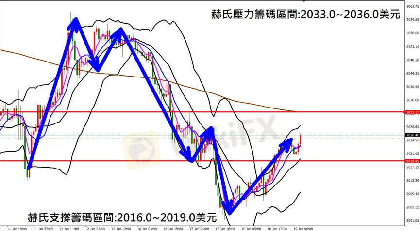 今日(1月19日)黃金早盤在2023.5美元/盎司附近,從技術分析面切入,1小時級別觀察黃金走勢符合昨日(18日)預測K棒出現反彈行情,多單成功獲利入袋,目前K棒短線保持多方排列,等待站穩中軌後有望持續一段,因此建議外匯市場投資人,今日黃金操作心態嘗試以偏多看法為主。