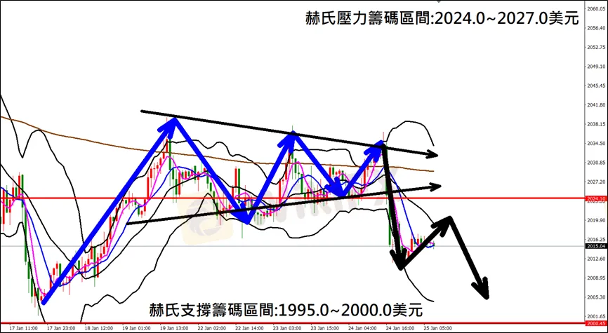 今日(1月25日)黃金早盤在2014.0美元/盎司附近,從技術分析面切入,1小時級別觀察黃金走勢昨日(24日)K棒盤中突破收斂三角上漲後,迅速轉跌重挫,目前K棒轉為空方排列,同時布林通道開口轉折朝下,因此建議外匯市場投資人,今日黃金操作心態嘗試以偏空看法為主。