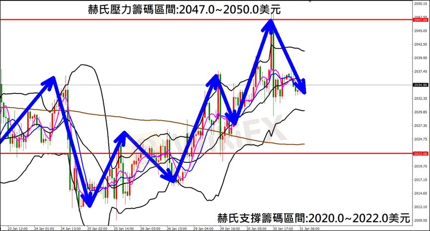 今日(1月31日)黃金早盤在2032.5美元/盎司附近,從技術分析面切入,1小時級別觀察黃金走勢符合昨日(30日)預測K棒盤中急速上漲突破,多單獲利入袋,目前K棒拉回至布林通道中軌附近,若今晚利空消息使得布林通道開口轉折朝下,則有望一波重挫,因此建議外匯市場投資人,今日黃金操作心態嘗試以偏短空看法為主。