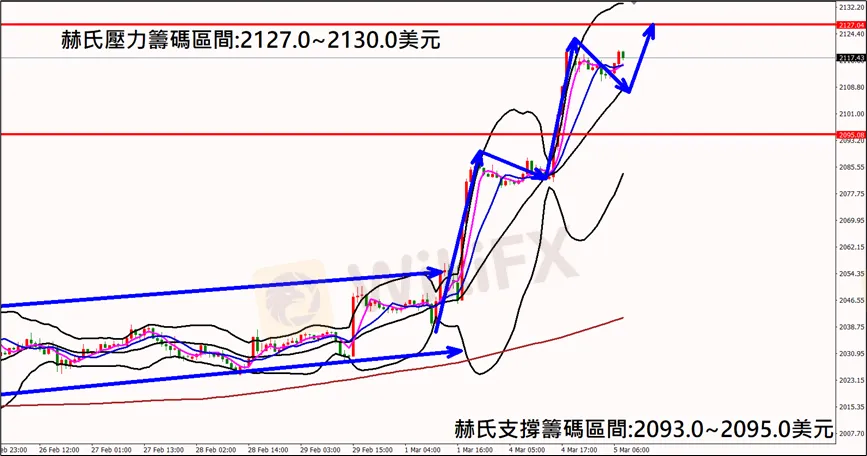 今日(3月5日)黃金早盤在2114.0美元/盎司附近,從技術分析面切入,1小時級別觀察黃金走勢昨日(4日)K棒符合直播測玉盤中突破後持續衝高,多單順利獲利,目前K棒維持均線支撐上方,同時布林通道開口持續朝上擴張,並且保持多方浪型,因此建議外匯市場投資人,今日黃金操作心態嘗試以偏多看法為主。
