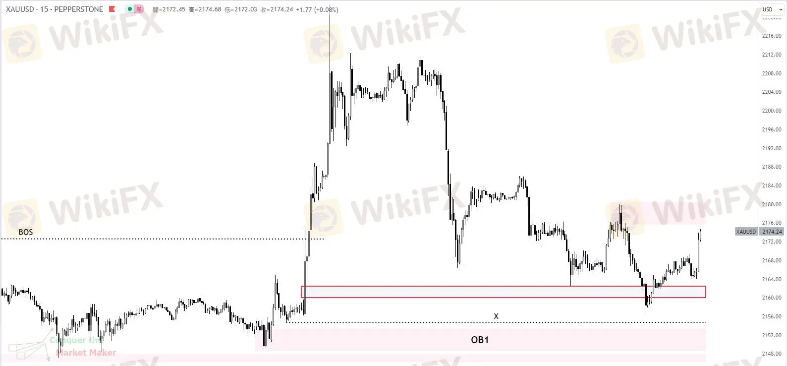 黃金15分鐘圖顯示技術性修正階段已啟動,上方首要阻力位於2180美元/盎司。在缺乏結構性轉變(CHOCH)的情況下,黃金可能會持續下行,並有可能進一步測試2148~2154美元/盎司水平,操作方面可以留意OB1的攻守表現。