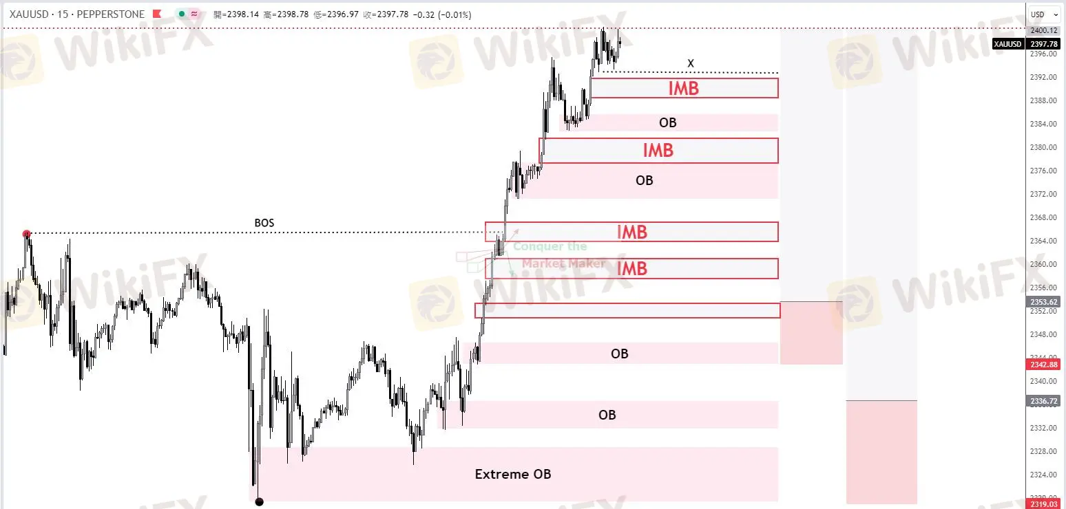 黃金的15分鐘圖顯示出多頭趨勢,並且主要支撐位於2319~2328的Extreme OB區域。短期來看,黃金可能面臨技術性修正,預計回徹的第一目標位於2363~2367的IMB流動性失衡區域,建議在操作上關注IMB附近的的防守表現,並配合低時間格局進場操作。