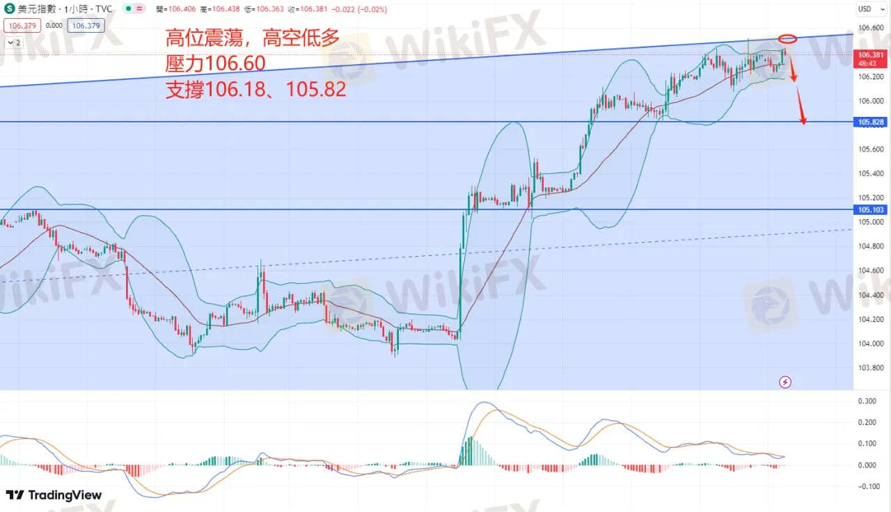 建議關注壓力106.6,壓力之下承壓做空。支撐關注106.18和105.82,支撐企穩可參與反彈。