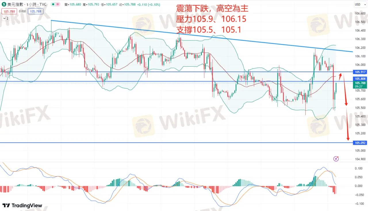 #美元指數 繼續在壓力區震蕩下跌,建議繼續高空為主。建議關注壓力105.9和106.15,壓力之下承壓空。下方支撐看至105.5,跌破後延續下跌趨勢看至105.1。對應 #eurusd、#gbpusd 建議關注H1布林下軌附近配合企穩訊號逢低買升。