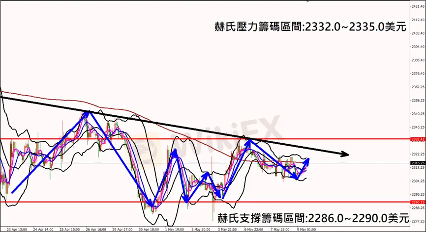 今日(5月9日)黃金早盤在2308.4美元/盎司附近,從技術分析面切入,1小時級別觀察黃金走勢昨日(8日)K棒拉回震盪後出現一波反彈行情,目前K棒落在中軌20MA附近震盪,若是上方壓力突破失敗,將有望持續向下修正,因此建議外匯市場投資人,今日黃金操作心態嘗試以偏空看法為主。