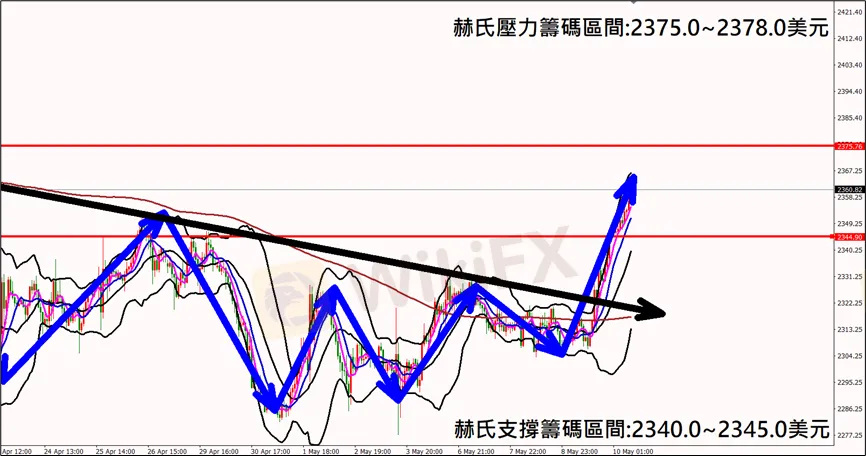 今日(5月10日)黃金早盤在2346.0美元/盎司附近,從技術分析面切入,1小時級別觀察黃金走勢昨日(9日)K棒震盪後出現強勢反彈,同時突破下降壓力線,目前K棒呈現多方排列,有望小幅拉回後再次上漲,因此建議外匯市場投資人,今日黃金操作心態嘗試以偏多看法為主。