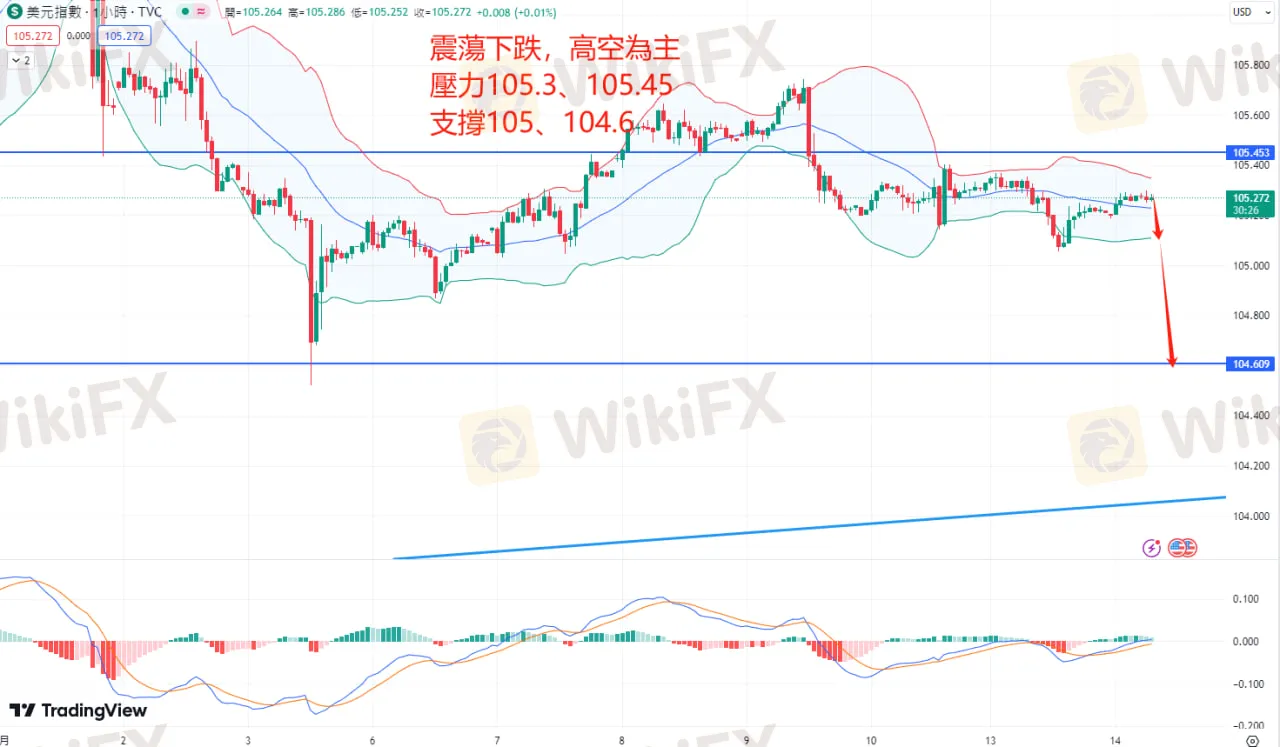 下方支撐看至105,跌破後看104.6。對應 #eurusd、#gbpusd 建議關注H1布林下軌附近企穩低多為主。