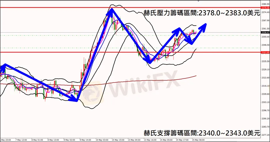 今日(5月15日)黃金早盤在2357.1美元/盎司附近,從技術分析面切入,1小時級別觀察黃金走勢昨日(14日)K棒低點震盪後反彈站上短均線支撐,目前K棒呈現短多方排列,有望小幅拉回後再次上漲,因此建議外匯市場投資人,今日黃金操作心態嘗試以偏多看法為主。