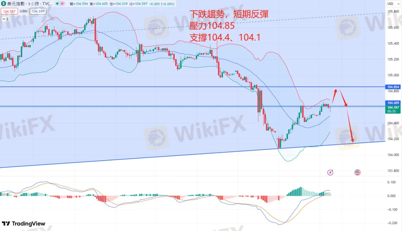 #美元指數 建議繼續逢高做空為主,短期或還有反彈空間。建議關注壓力104.85,壓力位配合承壓訊號高空。下方支撐關注104.4和104.1,跌破104.1則進入長期下跌,打開下跌空間。