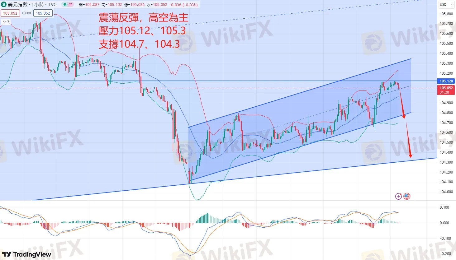 下方支撐關注104.7,跌破後看104.3,跌破104.3打開下跌空間。