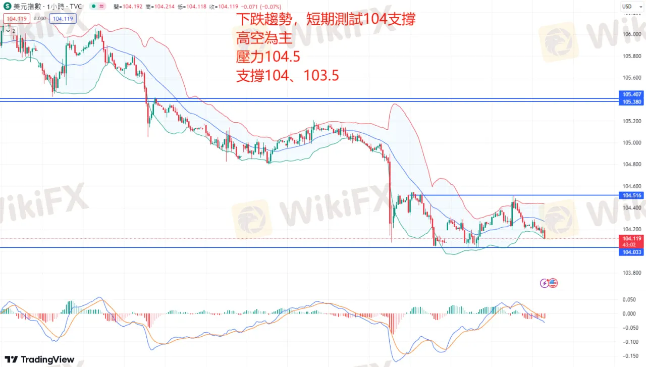 對應 #eurusd、#gbpusd 建議關注回檔H1布林下軌附近配合macd金叉逢低買漲為主。跌破104後,美元下方看支撐103.5。