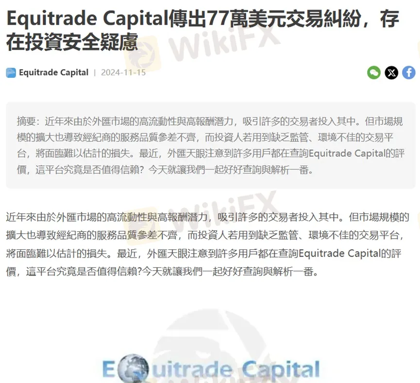 摘要:各位投資人請注意,外匯天眼在2024年11月曾針對Equitrade Capital這家高風險券商發布過示警,指出該平台與投資人傳出高達77萬美元的交易糾紛,詳細報導相關經過,並建議用戶盡可能遠離以免受害。根據最新得到的消息,目前這家交易商確認已經爆雷潛逃。