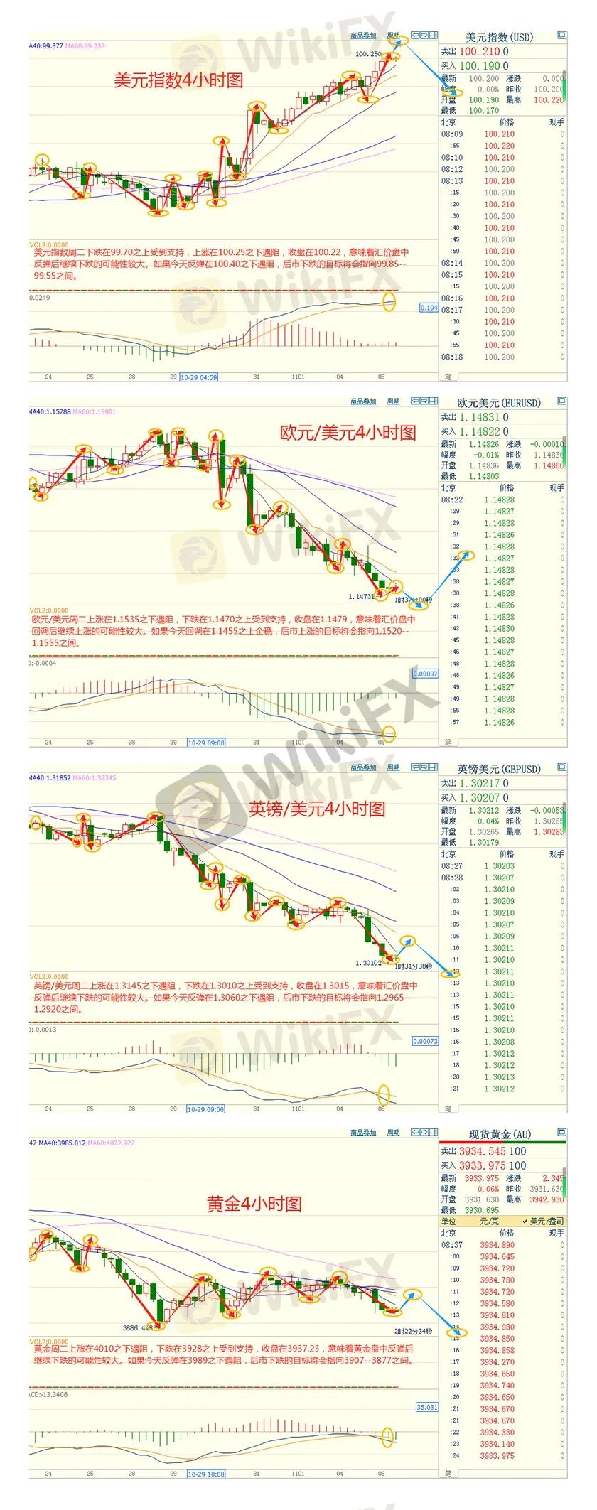 週二,因美國聯準會內部分歧引發對今年再度降息前景的懷疑,美元指數延續漲勢,並上破100大關,創三個月來的新高,最終收漲0.33%,報100.18。基準的10年期美債收益率最終收報4.090%,對聯準會政策利率敏感的2年期美債收益率收報3.586%。週二(11月4日)現貨黃金震盪下跌1.7%,收報3931.78美元/盎司,美國聯準會官員內部分歧加大,市場對聯準會12月降息預期降溫,幫助美元指數升破100關口,刷新逾三個月高點,對金價打壓明顯。不過,美國股市泡沫隱憂與美國政府史上最長停擺仍給金價提供避險支撐。短線內,黃金空頭略占上風,金價短線面臨進一步回調風險,但若週三ADP民間就業數據爆冷,金價或迎來戲劇性反轉。