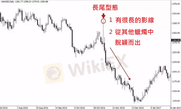 值得一提的是,在一段趨勢的頂部或底部位置出現長尾形態時,它就有可能是趨勢逆轉訊號,所以要格外小心。