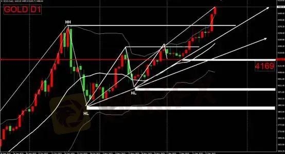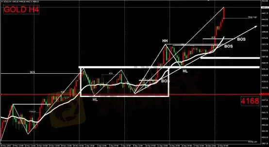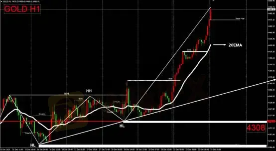 l 從四小時結構來看,自從有效突破4264美元/盎司後,多頭啟動快速且連續的強攻,已進入第三波結構性破位元(BOS),充分展現市場的避險情緒,在避險買盤的推進下,金價再次刷新歷史高位。當前價格仍持穩在20EMA均線上方,且整體上漲結構尚未出現疲軟信號,說明多頭結構依舊穩固。