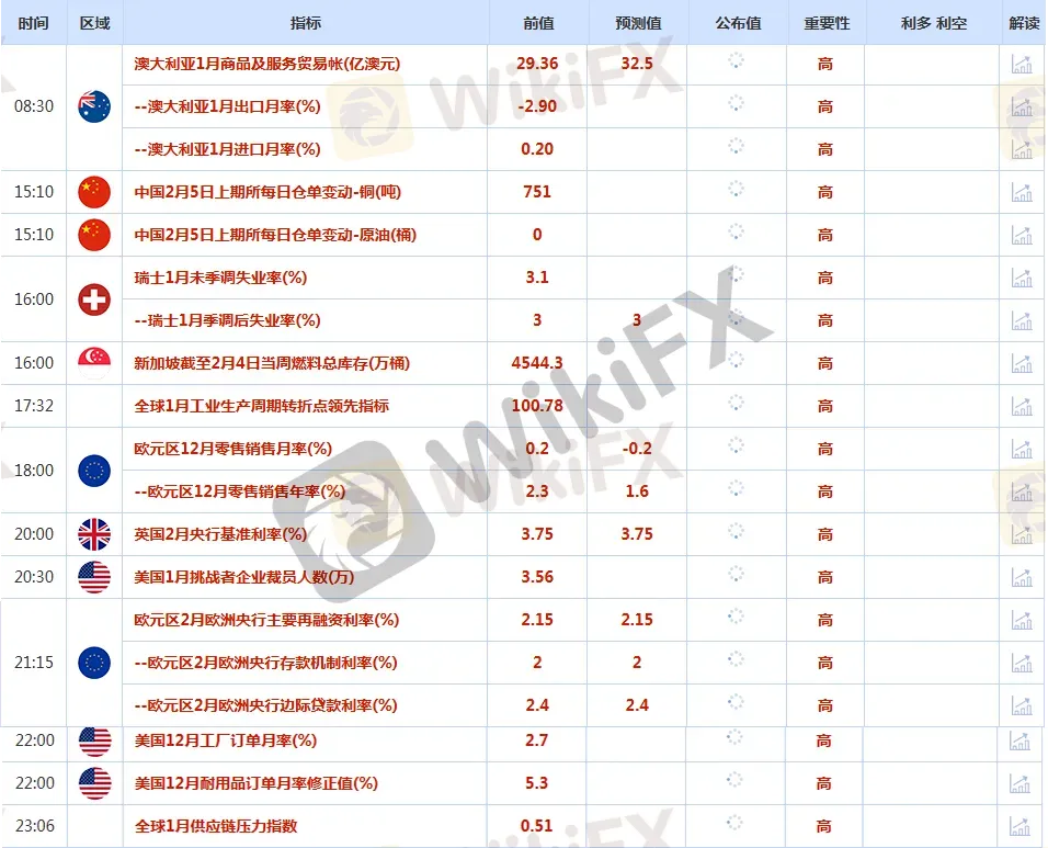 經濟數據方面,當日公佈的美國1月ADP民間就業崗位增長僅為22000個,遠低於市場預期的48000個,這為美國勞動力市場可能放緩提供了早期信號。然而,更具權威性的美國1月非農就業報告因政府停擺而推遲至2月11日發佈,這一關鍵數據的缺席使市場處於觀望狀態,等待更明確的經濟政策路徑指引。